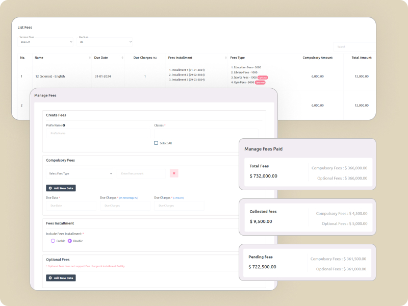 Fees Management Create different types and maintain comprehensive logs of payments. Ensuring accurate records and hassle-free transactions.