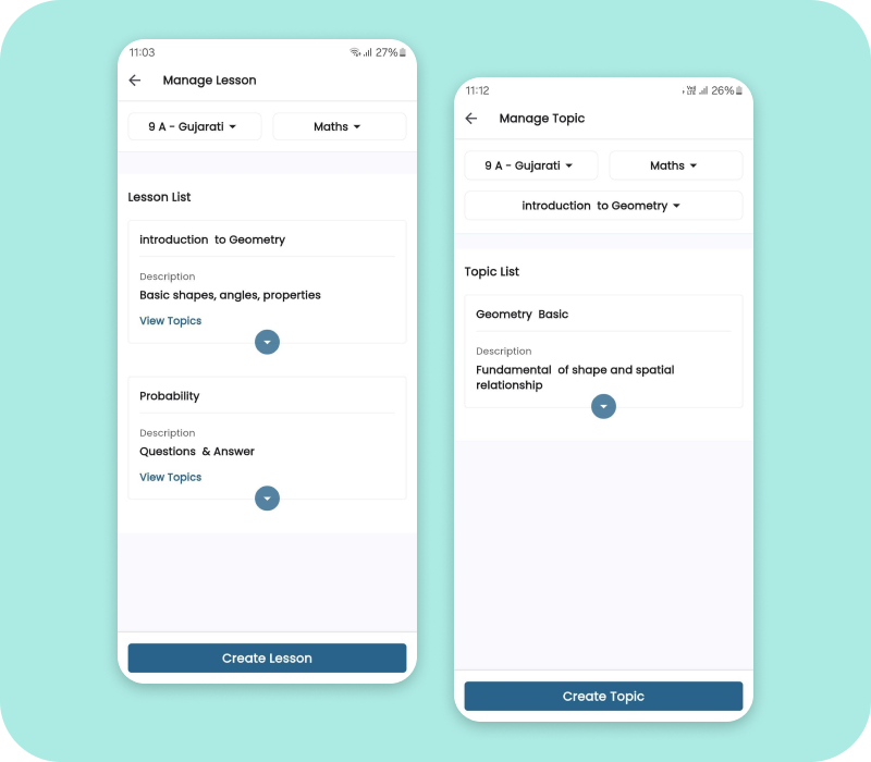 Manage Lesson Enhance your teaching experience with our innovative application! Subject teachers can easily manage lessons and topics with just a few clicks.