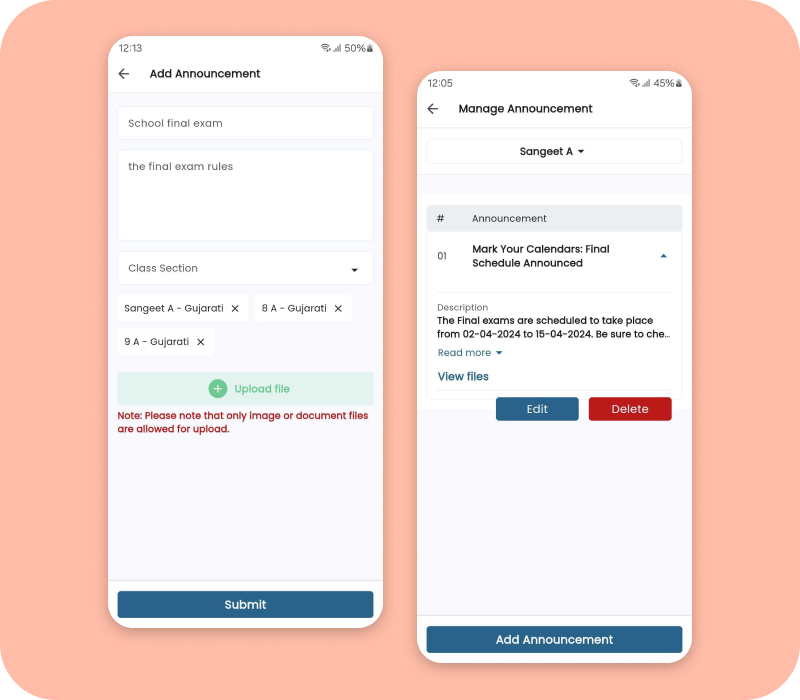 Announcements Users can send important announcements directly from our application, streamlining communication and ensuring timely dissemination of crucial information.