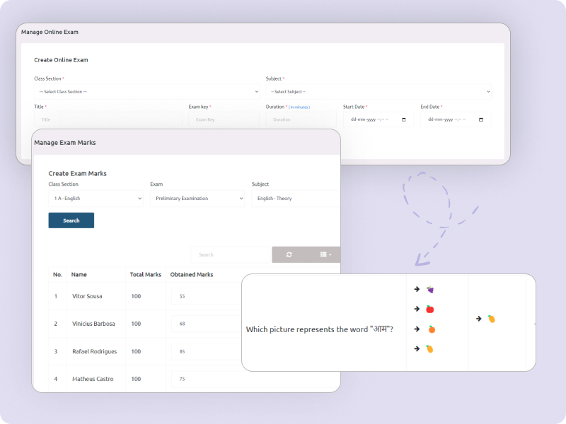 Effortless Exam Management Simplify exam scheduling and management with our online and offline sections. Easily schedule exams and publish results with ease and accuracy.